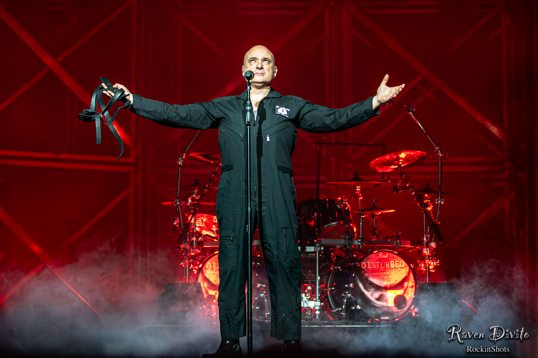 The volcano was primed, and with the iconic opening notes of “Voices” echoing through the arena, the crowd erupted into a frenzy as vocalist David Draiman was wheeled out in a Hannibal Lecter-style straitjacket, eliciting wild cheers from the metalhead audience. He escaped bondage, and the band launched into the opening track, igniting the night with powerful energy. Fans were singing along to every word, rapping and screaming in unison.