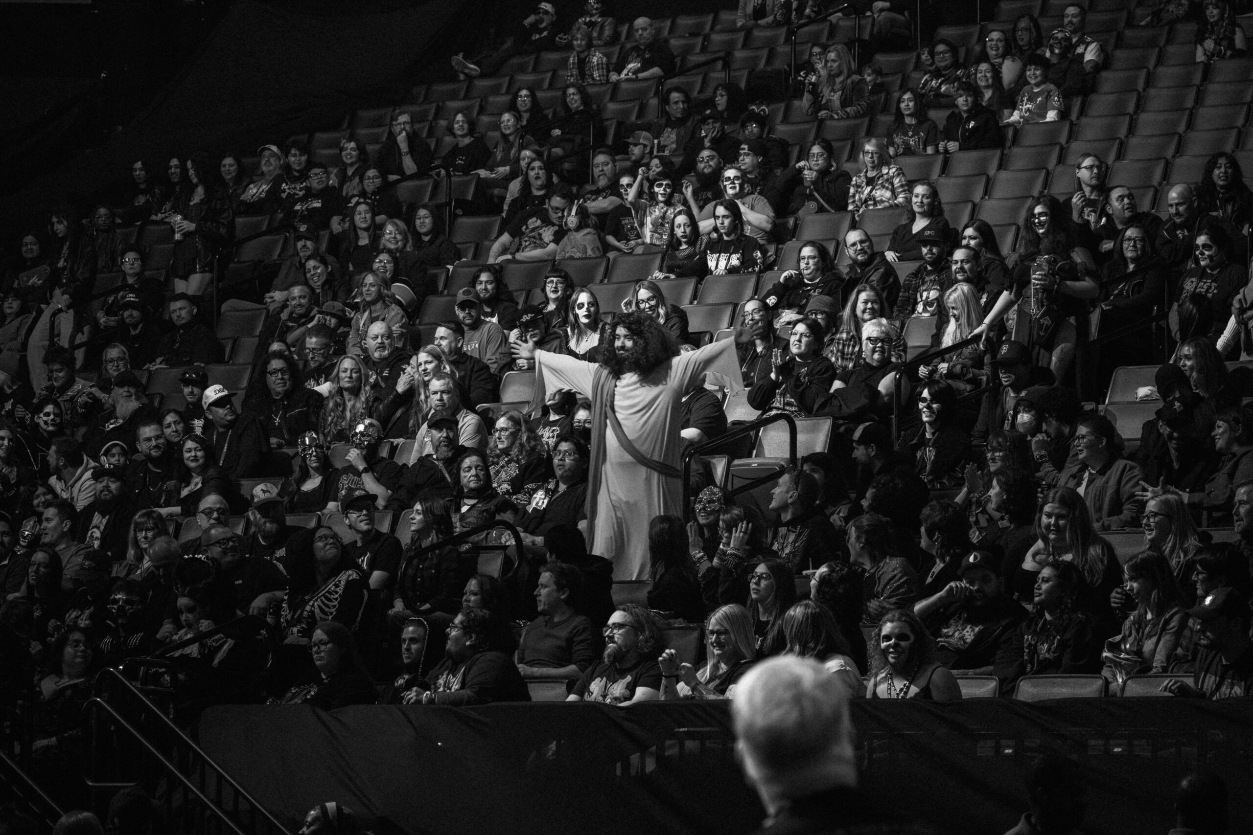 From the moment fans began filing in, the atmosphere was unmistakable. The crowd itself became part of the production, with hundreds dressed as undead priests, sinister nuns, and Nameless Ghouls. The arena floor resembled a living congregation. Strangers bonded instantly by complimenting costumes, trading chants, and singing snippets of Ghost lyrics before the band even took the stage. By the time the lights dimmed, the entire arena was buzzing with eerie anticipation.