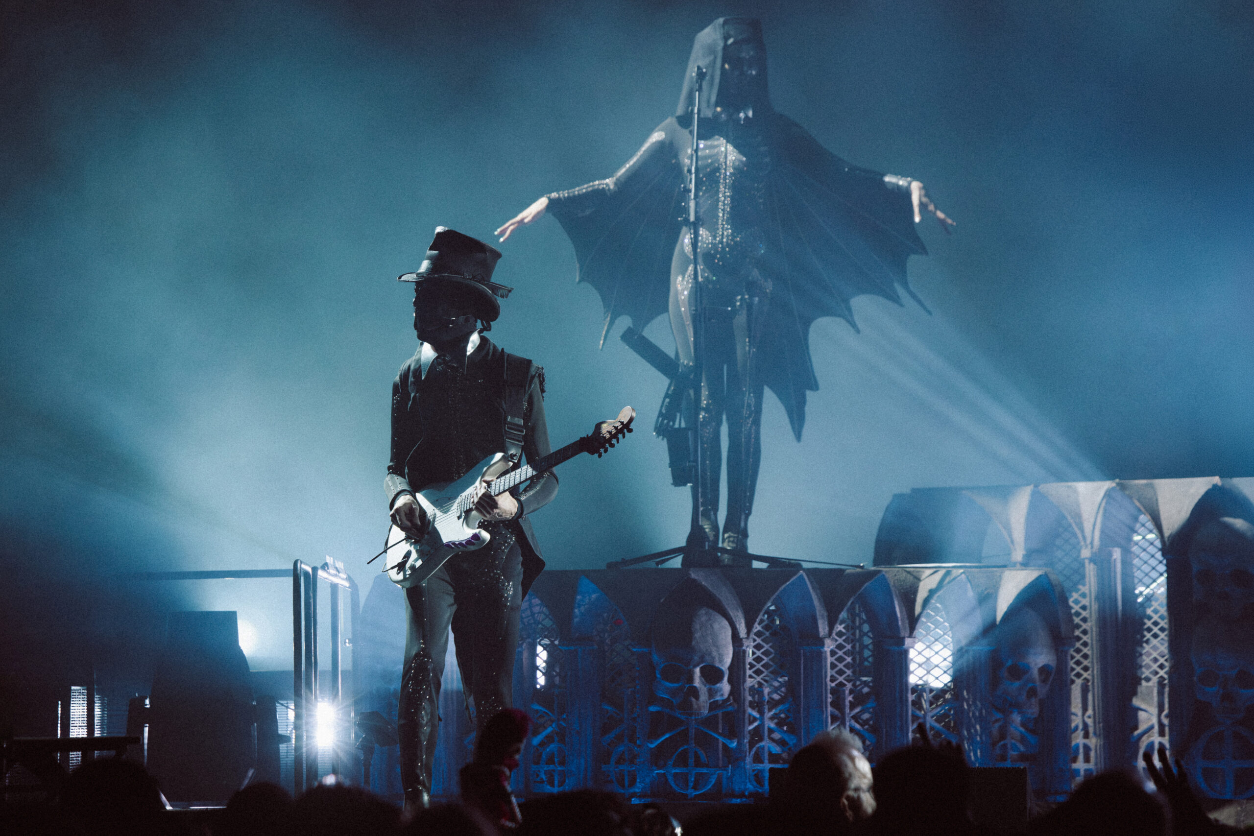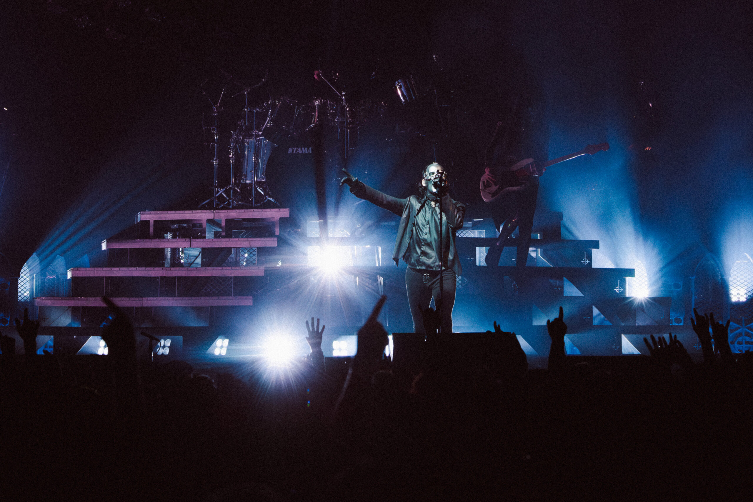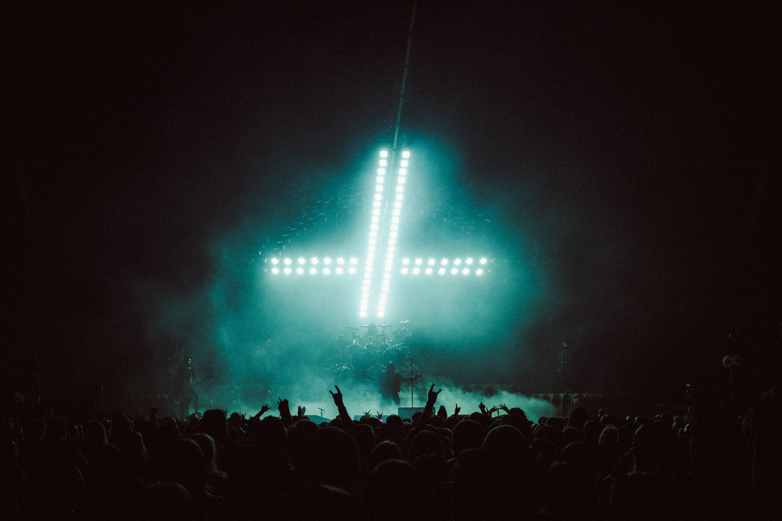 The first act opened with a towering giant cross made entirely of lights, looming over the stage like a glowing omen. Bathed in cold whites and deep purples, the band emerged to thunderous applause and immediately commanded the room. The mood was gothic, eerie, and electric. The crowd, already on its feet, never sat back down for the remainder of the night.